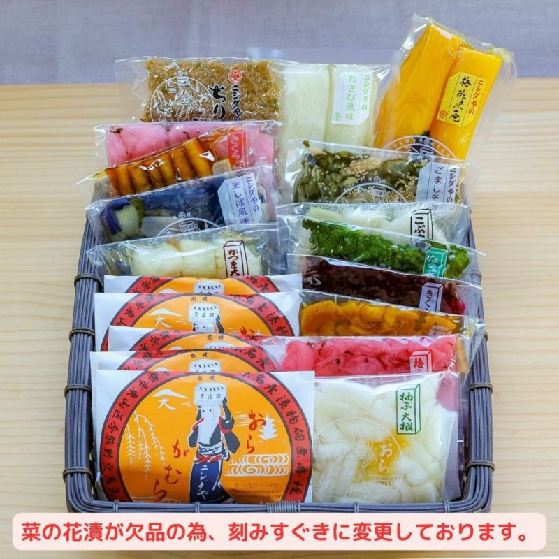 ★おらがむら漬け しば漬け風味 ★ハリハリ大根漬け ★柚子大根 ★ごましそ漬け ★きくらげ ★梅ふぶき ★昆布大根 ★かつお大根 ★生しば風味梅酢漬 ★ごぼうしょうゆ漬 ★さくら漬 ★長いもわさび ★梅酢沢庵 ★ちりめん山椒(中) ★刻みすぐき