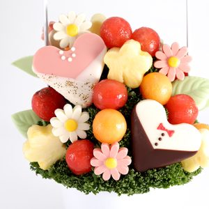 大小のハートやまんまるフルーツなど、旬のフレッシュなフルーツとチョコレートで、上品でかわいらしいギフトに仕上げました。