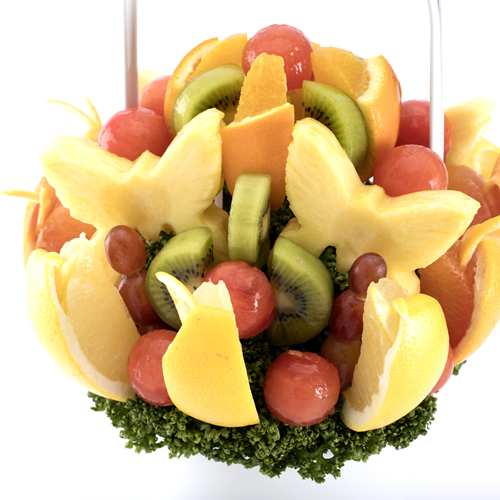 色とりどりのフルーツをアレンジメントしたところに、蝶の形にカットされたパイナップルが舞う上品で華やかなデザイン。