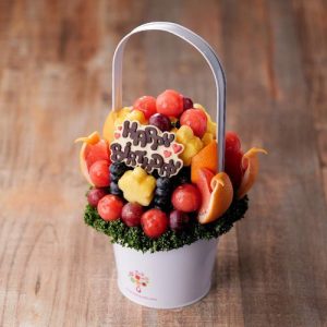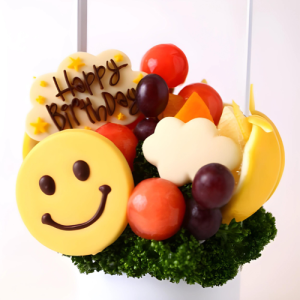 「Happy Birthday」のメッセージチョコとフレッシュなフルーツをたっぷりとアレンジメントし、ひとつひとつ手作り。