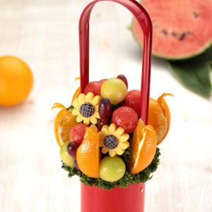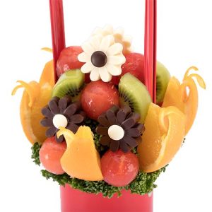 スイカ(夏季限定)、オレンジ、キウイフルーツと、フランス産高級チョコレートのお花をアレンジメントした、かわいらしいデザインの人気の商品です。
